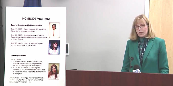 During a press conference on Monday, January 8, Virginia State Police spokesperson Corinne Geller announced the person responsible for three murders which occurred over 30 years ago in the Hampton Roads area. The three victims are pictured to the left.