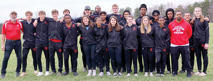 The Lancaster High School indoor track team competed last week at the Class 1/2 combined meet in Lynchburg, where the boys team finished third in the state. The LHS boys and girls state competitors from left are (front row) coach James Timm, Matthew Kane, Josh Woolard, Creston Saunders, Jeremia Laws, Grace Lawrence, Danyiah Cofield, Sarah McGee, Ayla Saunders, Marley Bean, Kiera Coleman and coach Draper Washington; (next row) Porter Pittman, Brady Vanlandingham, coach Markus Ferguson, Traniell Kelley, Reece Rhodes, Kenneth Owens, Xavier Gaddy, Trajan Waddy, Branndonn Wade, Isaiah Minter and Allison Foulkes. Photo by Robyn Saunders