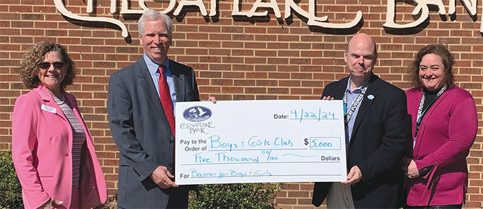Chesapeake Bank and Chesapeake Wealth Management continue to support the Boys & Girls Club of the Northern Neck. Their annual $5,000 contribution sponsorship this year goes toward the “Banners for Boys & Girls Club” building and supporting great futures. From left are Paula Owens, assistant vice president Chesapeake Bank Mortgage Lending; Kemp Gaskill, vice president Chesapeake Wealth Management; Phillip Mumford, chief executive officer Boys & Girls Club; and Jackie Ammons, marketing director, Boys & Girls Club.
